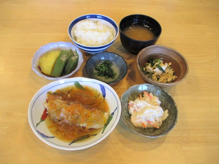 ごはん、えのきのみそ汁、白身魚の野菜あんかけ、豆腐とにらの炒め物、さつまいも煮、