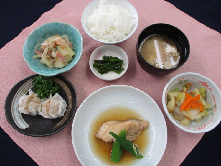 ご飯、かぶと油揚げのみそ汁、めばるの煮付け、ジャーマンポテト、キャベツと竹輪の辛子和え、蒸ししゅうまい、わかめ磯漬
