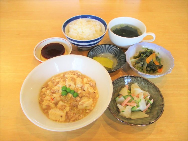ごはん、中華風スープ、麻婆豆腐、ほうれん草のソテー、かぶのサラダ、たくあん漬け、プリン