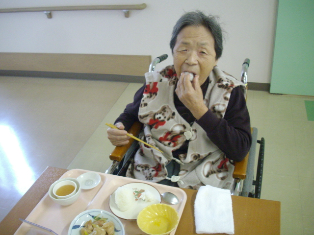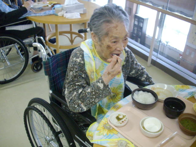 本日の昼食の様子です。皆さん笑顔でおいしそうに食べております。お客様がおいしそうに食べているのを見ると、私達職員も嬉しくなります。これからもおいしい食事を提供し、笑顔を増やしていきたいと思います。