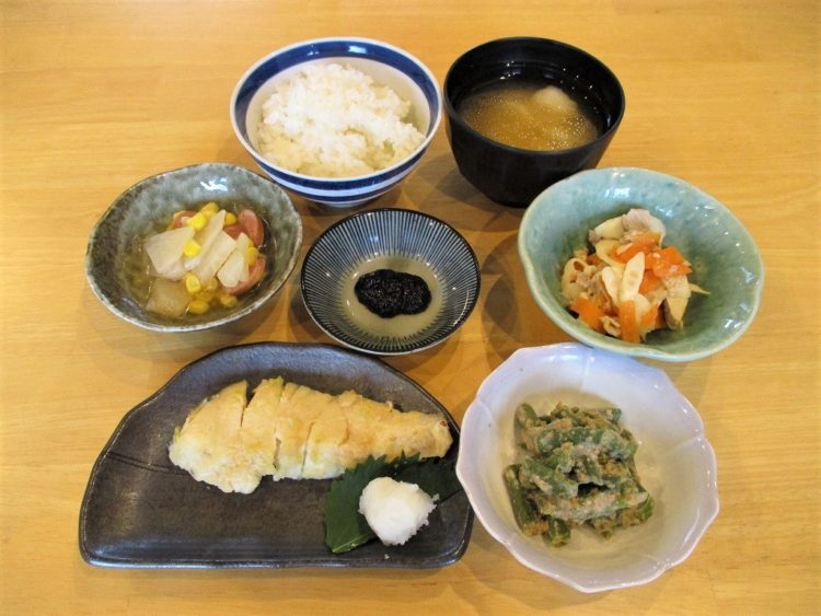 ごはん、えび団子のみそ汁、ホキのネギ味噌焼き、かぶのポトフ風、たけのこの炒め物、