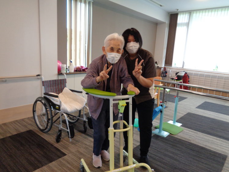 N.S.さんの歩行訓練の様子です。リハビリのIさんとおしゃべりしながら、楽しそうです。