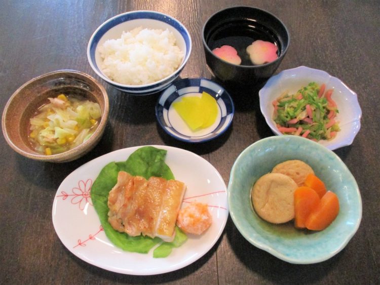ご飯、花麩の清汁、鶏肉のもみじおろし添え、がんもの煮物、胡瓜のわさび和え、