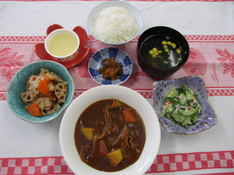 ご飯、わかめとコーンのスープ、ポークカレー、アスパラとカニカマのサラダ、れんこんの金平、福神漬、ラフランスゼリー