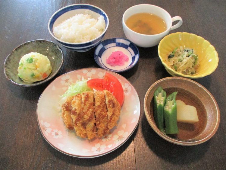 ご飯、あさりのスープ、とんかつ、かぶの煮物、しらすと大根の中華風、ポテトサラダ、
