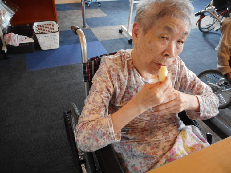 10月も中旬にさしかかり、実りの秋を迎えています。本日はI様のご家族様より、りんごをたくさん頂き、お客様皆様に提供しました。お客様から「わぁーめずらしい」「めーじゃ」と喜んで摂取されていました。園の外から見えるリンゴも赤く染まり、岩木山の紅葉も徐々に色濃くきれいに見えています。寒暖の差が激しく体調を崩しやすい季節ですが感染症等の発生なく経過しています。手洗い、消毒を継続し元気に生活して頂けるように取り組んでいきます。 ショート山崎(K,M)