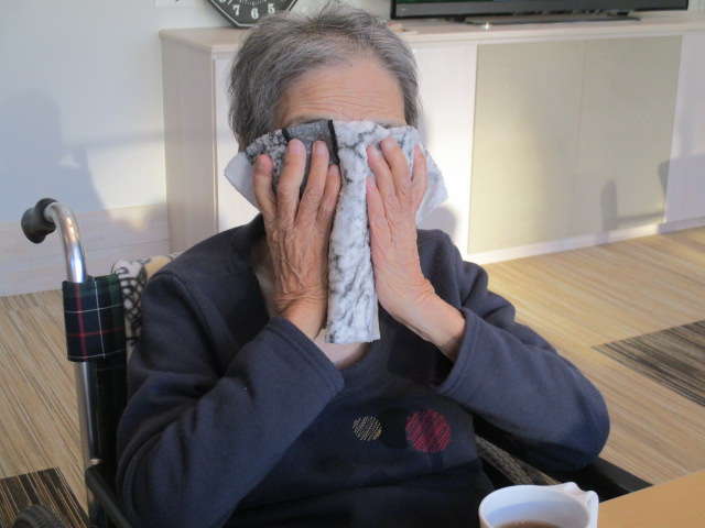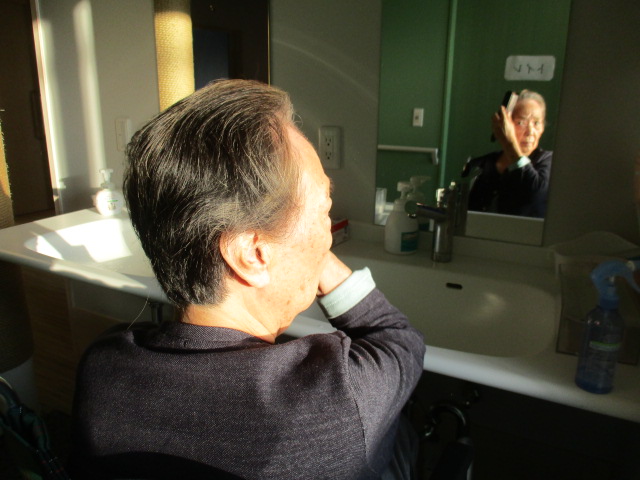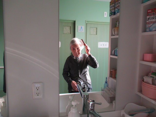 本日は朝の整容の様子をご紹介致します。それぞれ居室にてお着替えをされた後、洗面所やトイレへ移動されます。口腔ケア後鏡を見てヘアスタイルを整えます。I様はスムーズにヘアスタイルが決まり笑顔です。その後は蒸しタオルで洗顔です。温かいタオルでゆっくり顔を拭くと、皆様笑顔で「さっぱりした」とおっしゃり、お客様同士顔を見合わせ、お互いに「おなごぶり上がったなー」と大笑いしています。