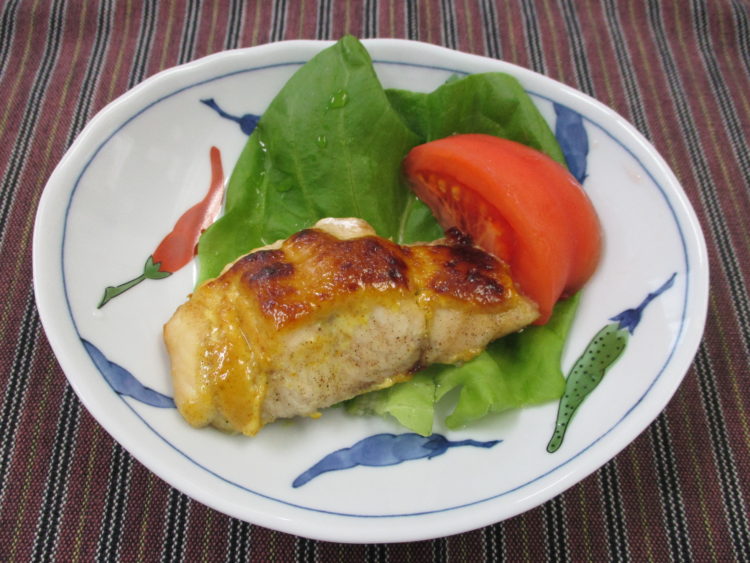 ご飯、わかめともやしのみそ汁、さめの黄金焼き、キャベツと鶏肉の炒め物、おさかなとひじきの豆腐よせ、つぼ漬、大根の梅おかか和え