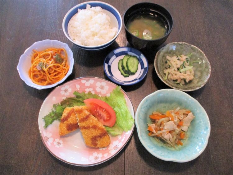 ご飯、オクラのみそ汁、白身魚フライ、もやしのソテー、ナポリタン、水菜のサラダ、