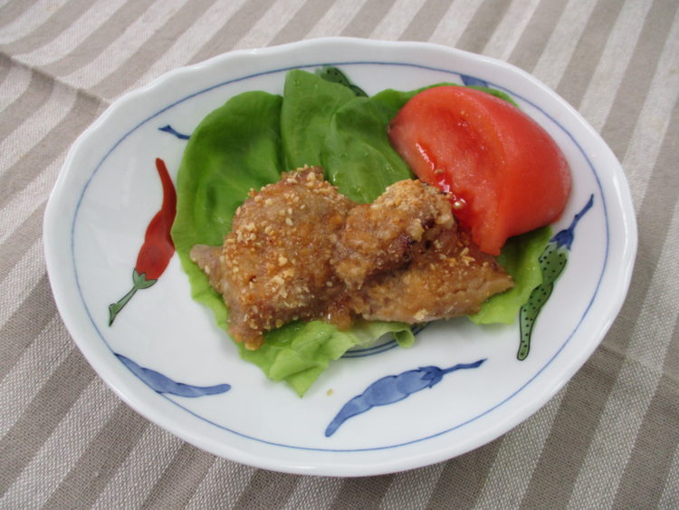 ご飯、花麩と三つ葉の清汁、鶏肉のピーナツ焼き、いんげんとえびの炒め物、スパゲティサラダ、野沢菜漬、みかんゼリー