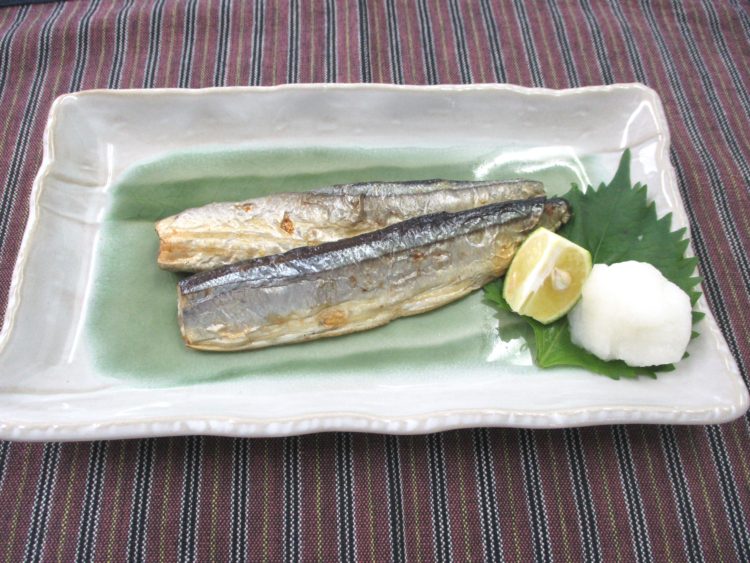 ご飯、わらびと高野豆腐のみそ汁、さんまの塩焼き、れんこんと鶏肉の炒り煮、