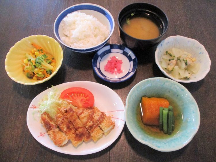 ご飯、玉葱のみそ汁、チキンカツ、南瓜の煮物、大根とあさりの炒め物、ブロッコリーのサラダ、