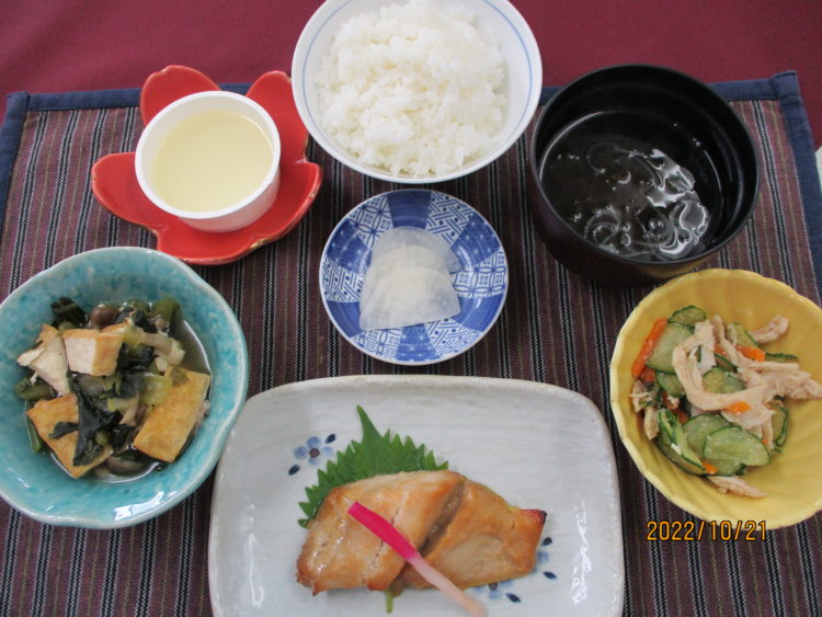 ご飯、もずくとねぎの清汁、ほっけの西京焼き、生揚げと小松菜の煮物、鶏ささみのごま酢和え、べったら漬、和梨ゼリー
