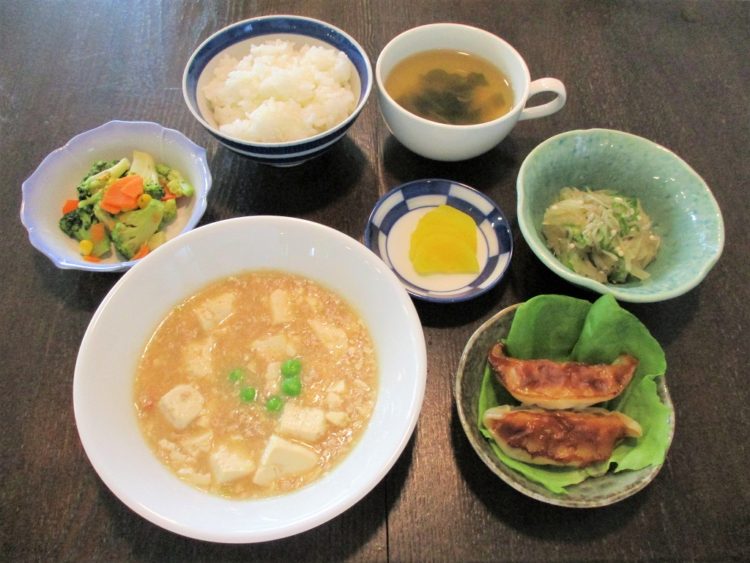 ご飯、わかめスープ、麻婆豆腐、焼き餃子、ブロッコリーのコンソメ炒め、しらすの中華サラダ、