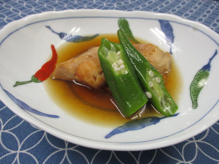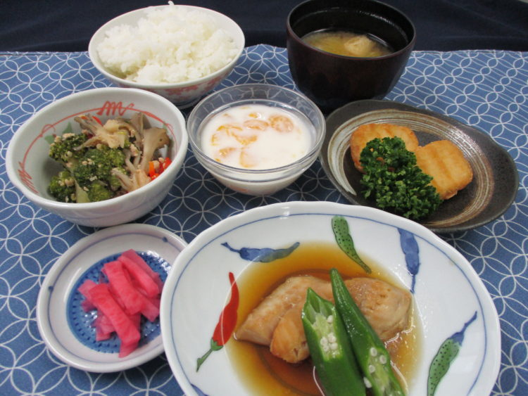 ご飯、白菜と油揚げのみそ汁、メバルの煮つけ、ブロッコリーのそぼろ炒め、豆腐ナゲット、赤かぶ漬、みかんヨーグルト