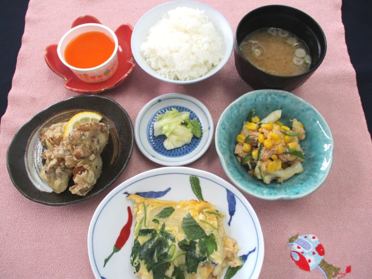 ご飯、あさりとねぎのみそ汁、鶏肉の親子煮、カリフラワーとツナのソテー、舞茸の天ぷら、