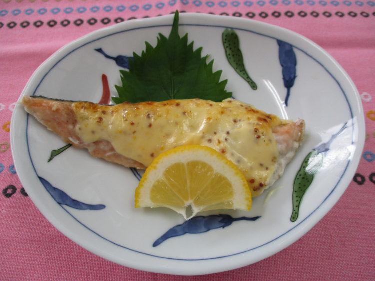 ご飯、大根となめこのみそ汁、鮭のマスタードソテー、れんこんと鶏肉の炒り煮、焼き餃子、しば漬、白菜の海苔和え