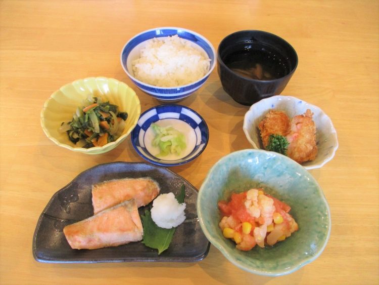 ご飯、椎茸のすまし汁、鮭みそ焼き、エビカツ、ほうれん草の炒め物、カリフラワーサラダ、