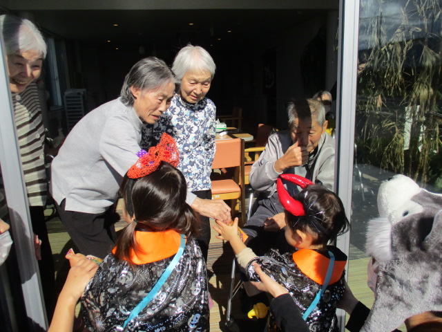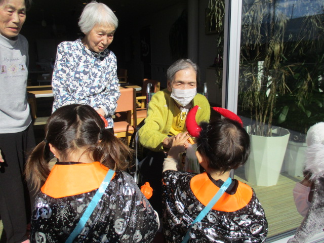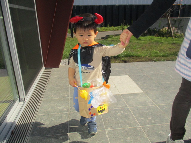 皆様こんにちは。あっという間に10月が終わりです。10月が終わりということは、本日はハロウィンでございます。午前、山崎保育園より仮装をした可愛いお客様が遊びに来て下さいました。お客様に順番でお菓子をプレゼントさせて頂きました。早く渡したくて皆様競争でございました。
