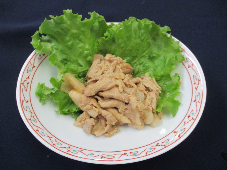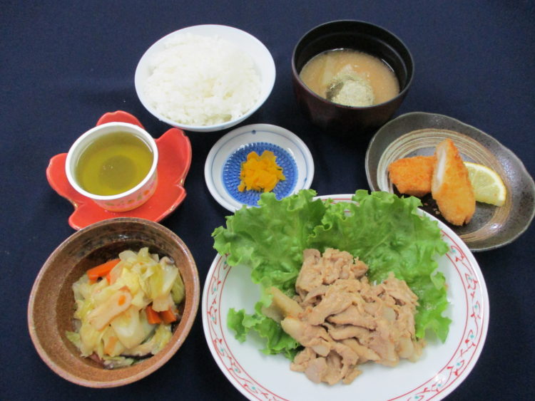 ご飯、大根ととろろ昆布のみそ汁、豚肉のオイスターソース焼き、キャベツとさつま揚げの炒め煮、イカフライ、つぼ漬、青りんごゼリー