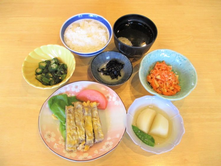 ご飯、観世麩のすまし汁、牛肉のピカタ、かぶの煮物、人参の子和え、オクラの和え物、