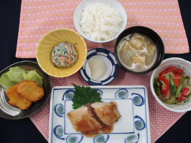 ご飯、白菜と油揚げのみそ汁、あじのソテー梅ソース、アスパラと豚肉のソテー、チキンナゲット、ぜんまいの白和え、べったら漬