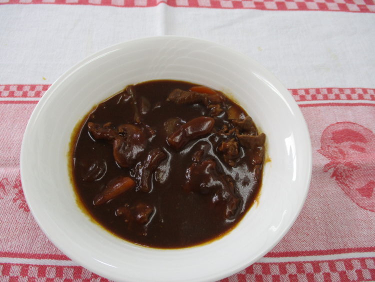 ご飯、豆腐とかいわれのスープ、薄切り牛肉のハヤシライス、ツナコーンサラダ、ごぼうと竹輪の煮つけ、福神漬、フルーツ杏仁豆腐