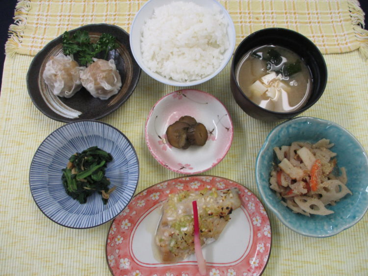 ご飯、豆腐とわかめのみそ汁、さわらの薬味焼き、れんこんのきんぴら、蒸ししゅうまい、ほうれん草のなめ茸和え、相馬きゅうり漬