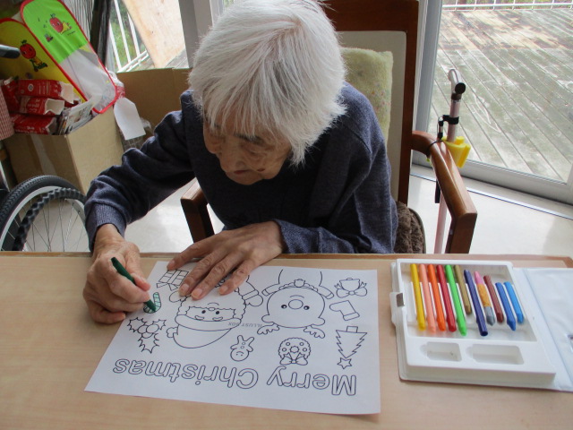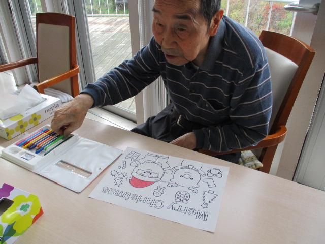 ブログをご覧の皆様、こんにちは。寒さが一段と厳しくなってまいりました。再来週には雪の予報も聞かれていますね。はたして初雪いつになりますか。。。ゆっくり訪れてほしいものです。さて今日はクリスマスの塗り絵を楽しみました。皆様「あ、サンタだ。もうそんな季節か」としみじみ話されておりました。最後は今年も楽しいクリスマスを過ごしましょうと談笑されておりました。