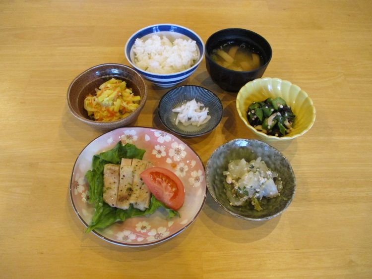 ご飯、板麩のみそ汁、鶏肉の塩だれ焼き、かぶの煮物、オクラの和え物、さつま芋のサラダ、