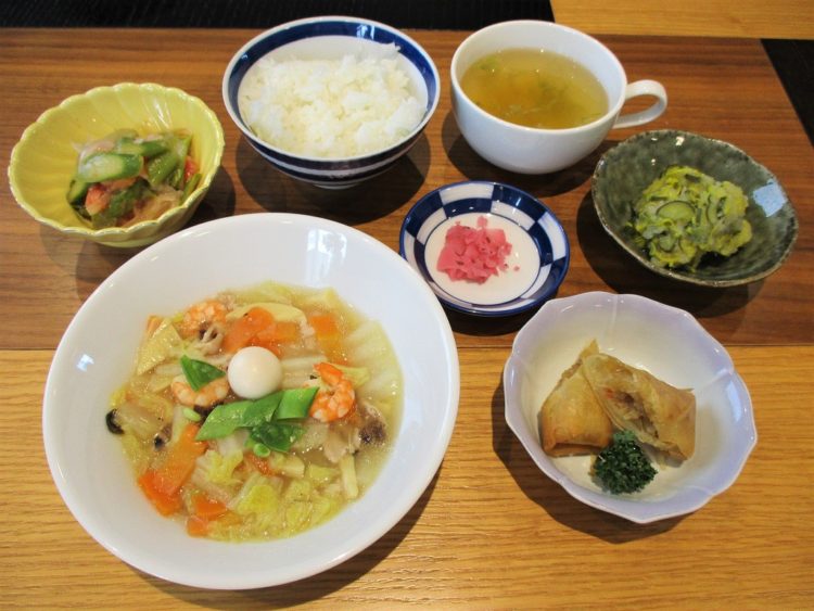 ご飯、レタスのスープ、八宝菜、春巻き、トマトサラダ、大根おろし甘酢和え、梅吹雪