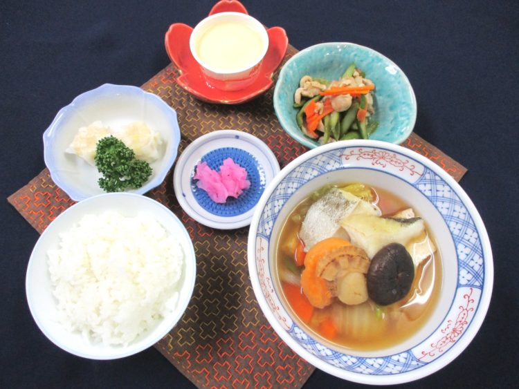 ご飯、鱈なべ、アスパラと鶏肉のソテー、コーンしゅうまい、桜大根漬、プリン