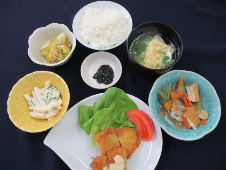 ご飯、かきたま汁、白身魚フライ、ふきと鶏肉の煮つけ、マカロニサラダ、白菜とあさりの辛子和え、のりつくだ煮
