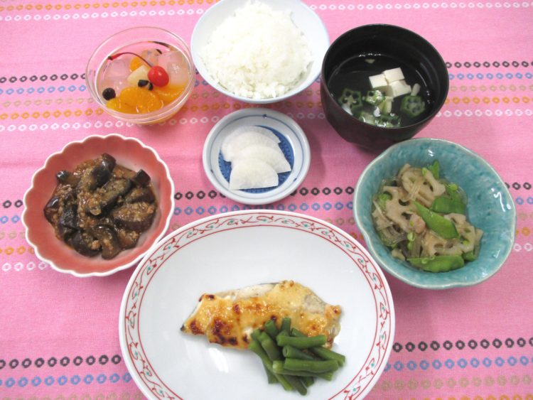 ご飯、オクラと豆腐の清汁、シルバーの味噌マヨネーズ焼き、春雨とれんこんのソテー、