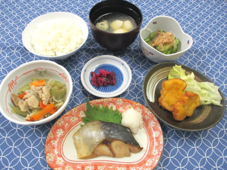 ご飯、里芋と油揚げのみそ汁、あじの生姜漬焼き、ふきと糸こんの味噌炒め、チキンナゲット、