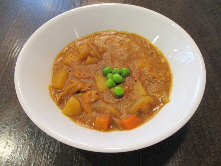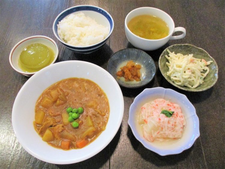 ご飯、レタススープ、ポークカレー、大根の煮物、スパゲティサラダ、福神漬け、青りんごゼリー