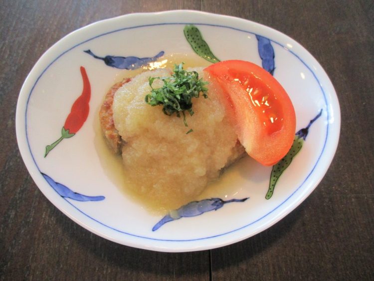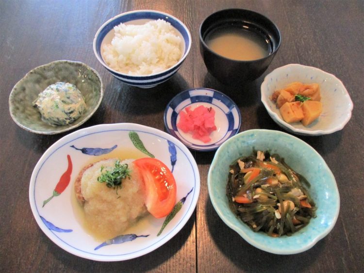 ご飯、あさりのみそ汁、和風おろしハンバーグ、たけのこの土佐煮、すき昆布の煮物、