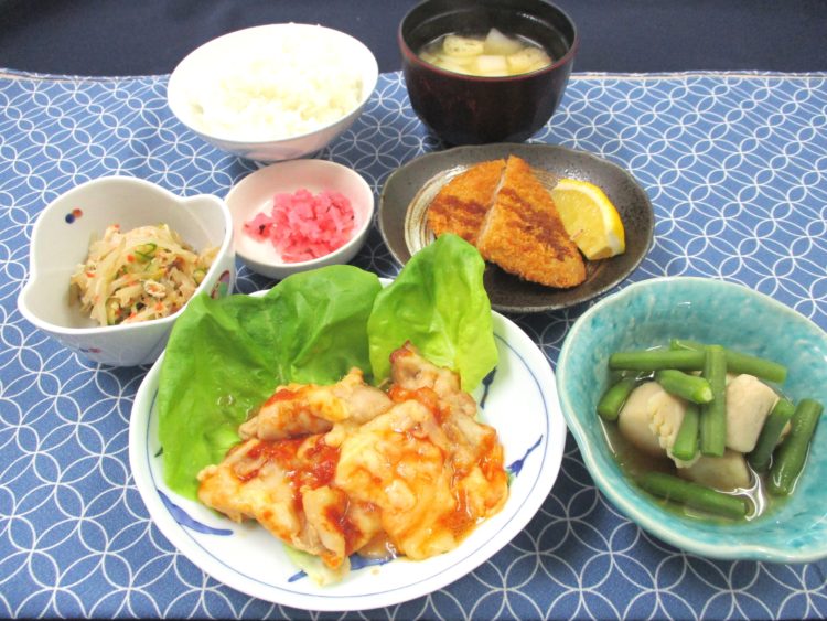 ご飯、白菜と油揚げのみそ汁、鶏肉のチーズ焼き、里芋といかの煮物、かつおフライ、