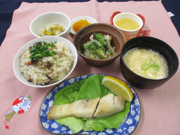 きのこご飯、かきたま汁、シルバーのムニエル、ブロッコリーとベーコンのソテー、かぶのゆかり和え、つぼ漬、ラフランスゼリー
