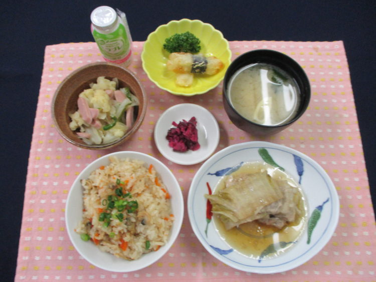 あさりご飯、細竹とわかめのみそ汁、豚肉と白菜の重ね蒸し、カリフラワーとソーセージのソテー、ながいも短冊揚げ、しば漬、ラブレ