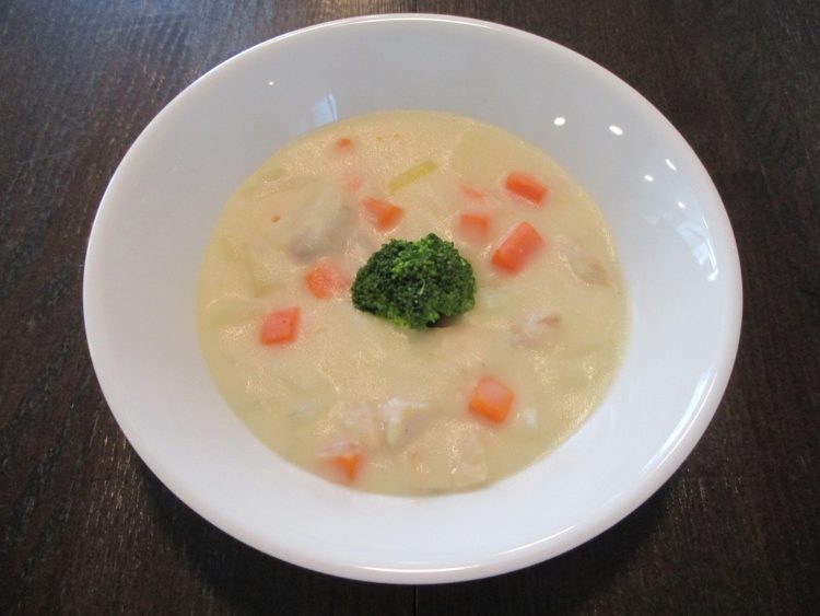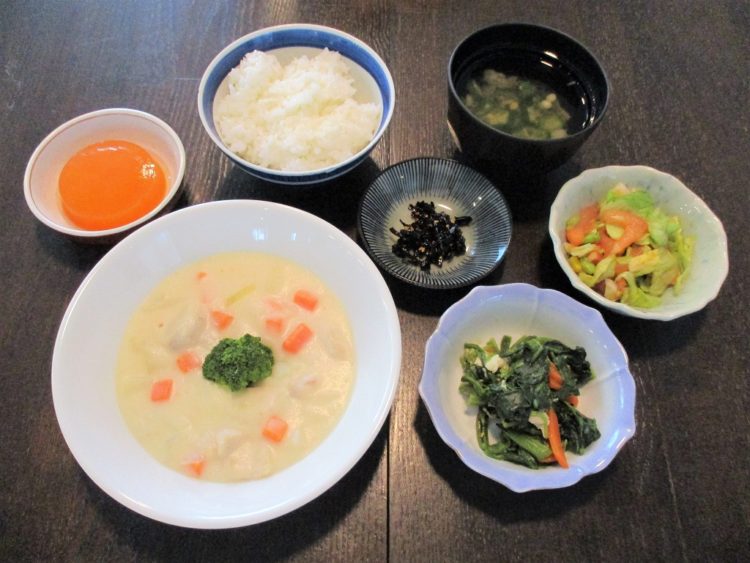 ご飯、オクラのすまし汁、クリームシチュー、ほうれん草のソテー、彩りサラダ、昆布佃煮、