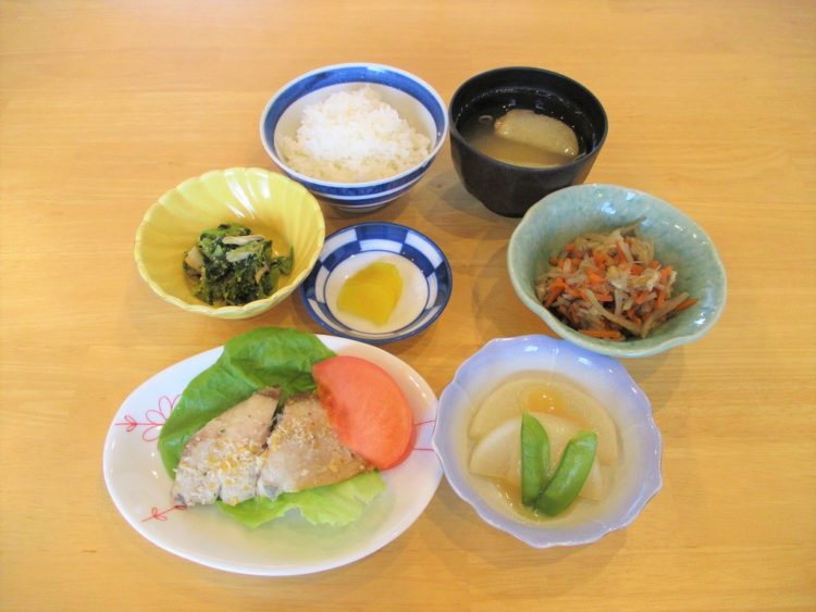 ご飯、棒麩のみそ汁、あじの香草パン粉焼き、ふろふき大根、きんぴらごぼう、