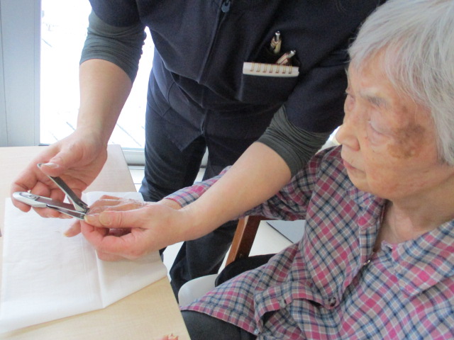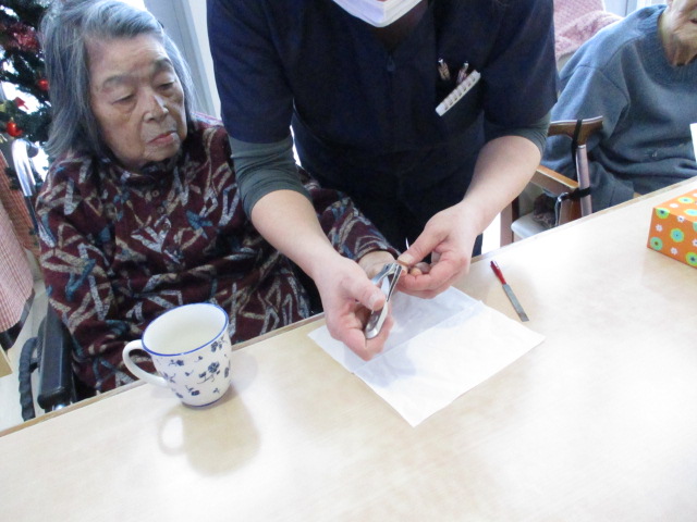 ブログをご覧の皆様、こんにちは。毎日雪が降りますね。12月でこんなに積もっているのは珍しい気がします。くれぐれも安全な生活をお過ごしください。さて、今日は職員が皆様の手足の爪を確認させていただきました。伸びてる方もいらっしゃり、綺麗に切り揃えました。「あー良かった、気になってたんだ」、「爪伸びるの早いな」等話されておりました。他にも清潔が保たれるように、日々観察を行ってまいります。