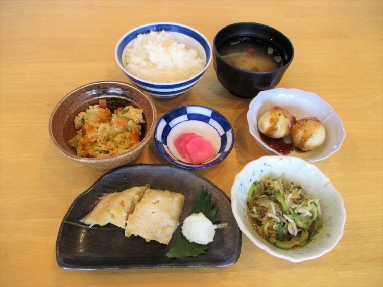 ご飯、なめこのみそ汁、ほっけのねぎ味噌焼き、たこ焼き、キャベツの卵炒め、もやしのお浸し、