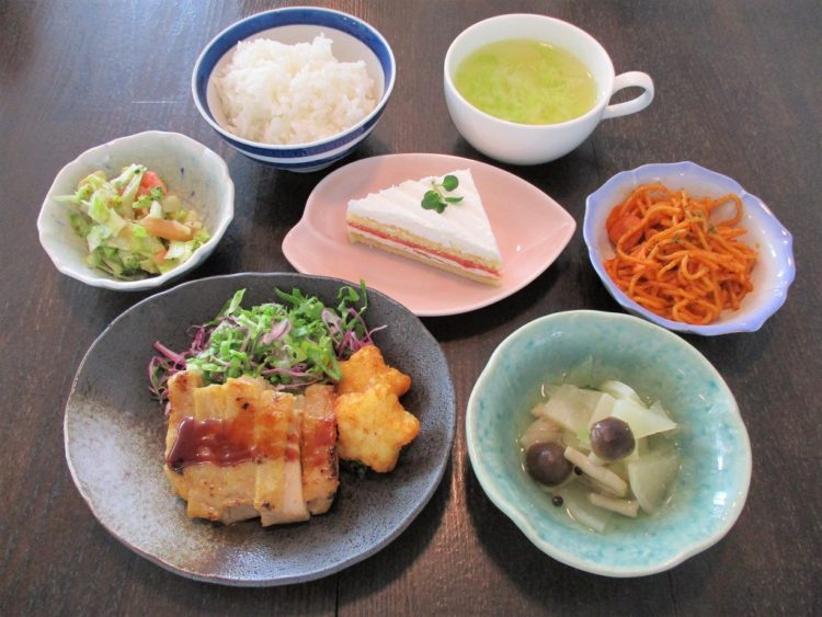 ご飯、コンソメスープ、チキンステーキ、かぶの洋風煮、ナポリタン、ブロッコリーサラダ、