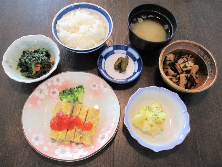 ご飯、ふきのみそ汁、豚肉のチーズピカタ、ジャーマンポテト、ひじきの煮物、