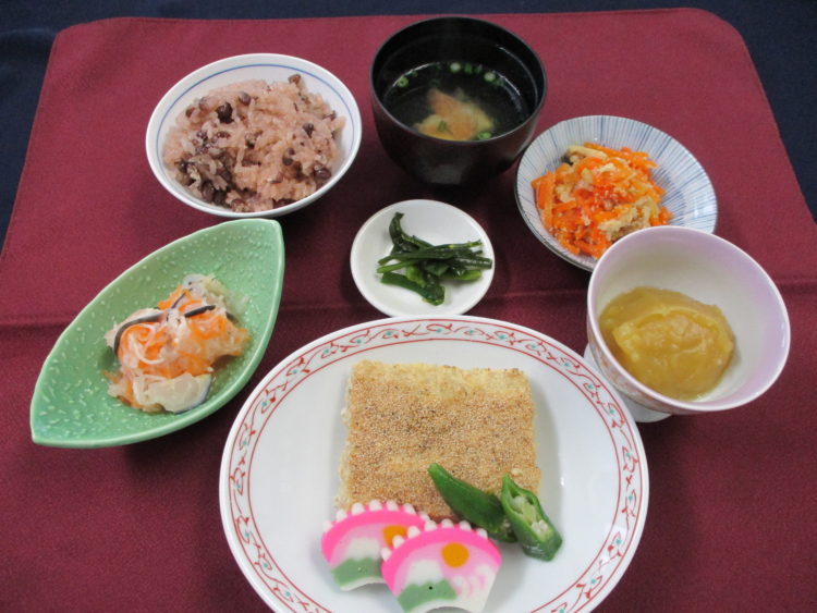 お赤飯、赤魚のすまし汁、鶏肉の松風焼き、栗きんとん、人参の子和え、氷頭なます、一口昆布巻き