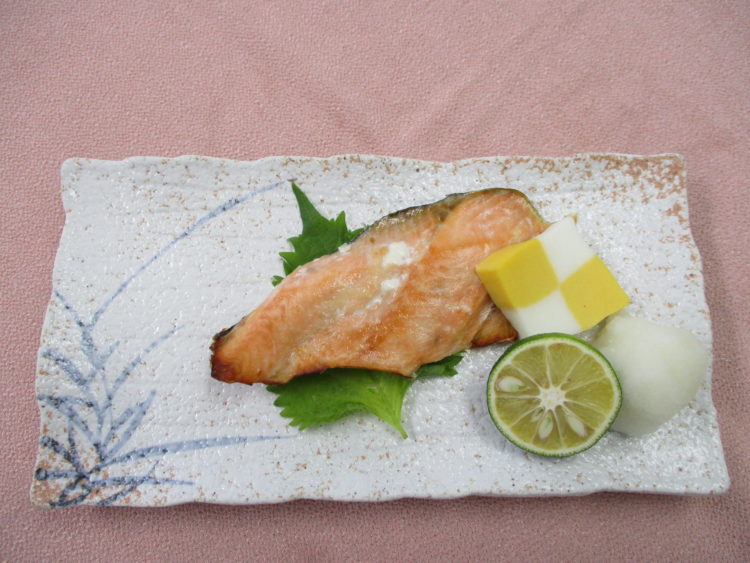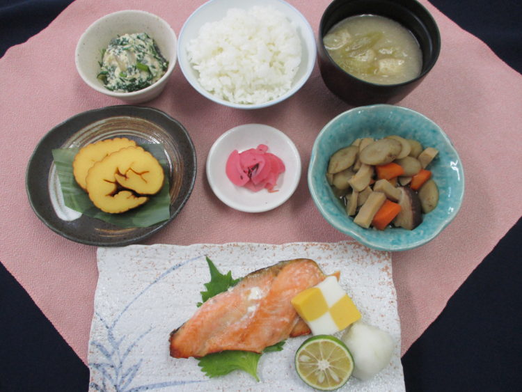 ご飯、ふきと油揚げのみそ汁、鮭の塩焼き、煮しめ、伊達巻、こんにゃくのおぼろ和え、梅吹雪漬