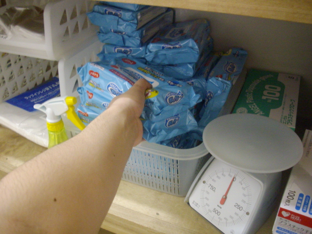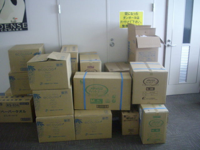 まず注文し発注したオムツ等はこのようにいくつも置かれます。様々なお客様に対応するために様々な種類とサイズがあります。ここから必要な分を持っていきます。