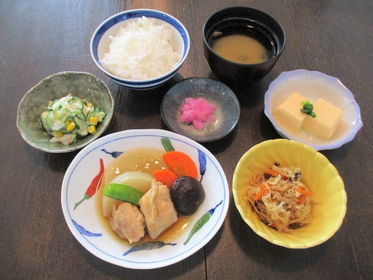 ご飯、まいたけのみそ汁、治部煮、たまご豆腐、切干大根の煮物、胡瓜のわさびマヨ和え、
